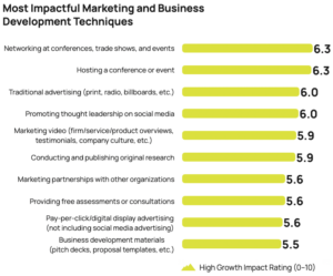 High Growth firms favor a diversified, multi-front strategy rather than a single solution. For the first time, hosting an event appears at the top of the impact list, sharing the limelight with networking at conferences and trade shows. Traditional advertising also surged into the top three, in a tie with social media thought leadership. By blending high-touch events with traditional and digital tactics—including original research and video—these leaders are successfully creating platforms for industry conversation.