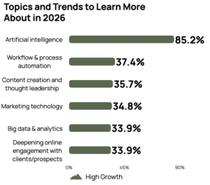 High Growth firms’ interest in AI jumped 63% this year, with 85.2% naming it a top priority for further study. This is followed by workflow and process automation.These two areas of interest suggest that efficiency and productivity are on these firms’ minds. In third place is content creation and thought leadership.High Growth firms recognize that creating thought leaders is a primary engine of growth.