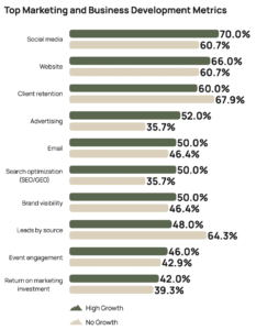 When it comes to marketing metrics, High Growth firms prioritize tracking visibility and expansion compared to their No Growth counterparts. For instance, they are much more likely to track advertising (52% vs. 35.7%) and SEO/GEO (50% vs. 35.7%). While top performers use analytics to optimize outreach and capture new market share, No Growth firms focus on more passive metrics like client retention and lead sources. This data suggests that while struggling organizations are preoccupied with protecting existing business, High Growth firms are interested in learning what works to drive new revenue.